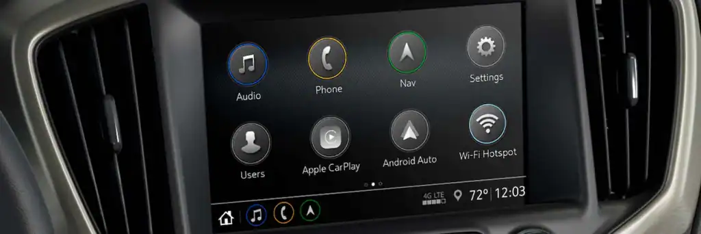 GM’s IntelliLink infotainment system has been around for years in Buick and GMC vehicles and continues to improve with time. The IntelliLink system consists of an 8-inch touch screen, showing eight icons at a time arranged in two rows of four. This screen can also have:
